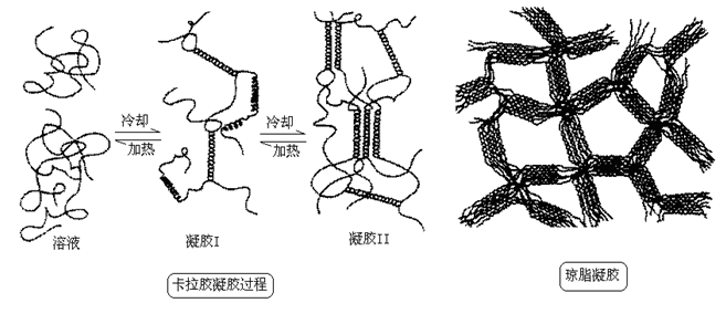 ⑥链间的相互作用:卡拉胶由于链的相互作用而形成具有三维网络结构的凝胶,溶剂被截留在网络之中,凝胶强度受α-D-吡喃半乳糖-2,6-二硫酸酯残基数和分布的影响。
