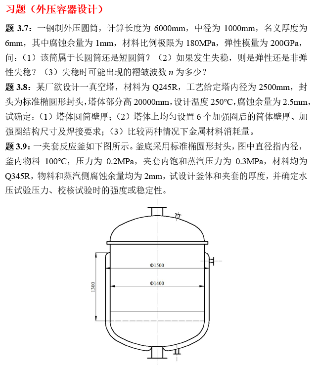 第1题为判断外压容器失稳类型并求出现的褶皱波数,大部分同学都能够求对,只是在求褶皱波数时,没有使用公式求解,或者没有考虑波数为整数;第2题为设计塔体圆筒壁厚以及设置加强圈后筒体壁厚,部分同学没有具体去比较两种情况下金属材料消耗量;第3题是设计夹套反应釜釜体和夹套的厚度,夹套是应该按照内压容器进行设计计算,部分同学仍然按照外压容器进行设计,出现了错误。