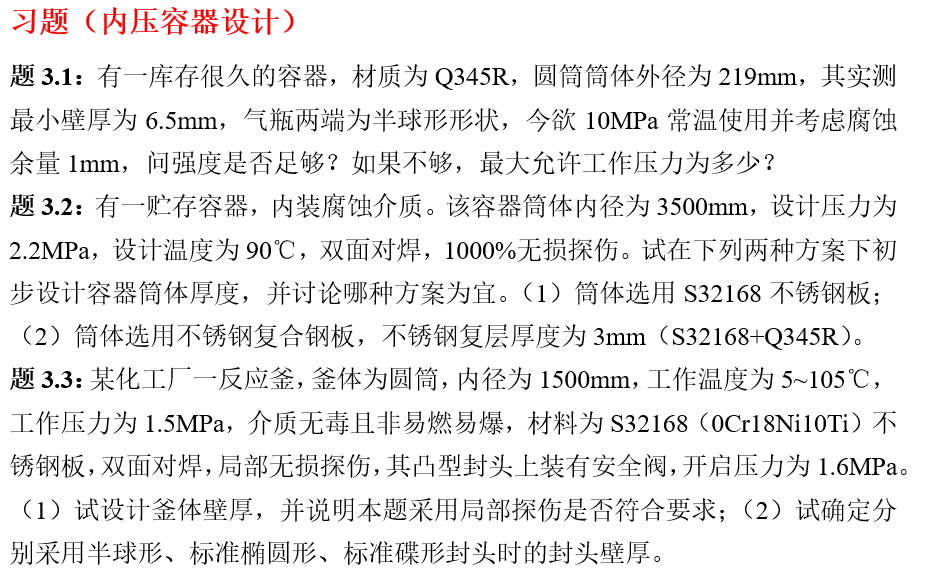 第1题为由已知条件判断强度容器强度是否足够,以及求最大允许工作压力的问题,大部分同学在求有效厚度的时候出现了问题,给定实测最小壁厚求有效厚度只需减去腐蚀余量,而不用减去厚度负偏差;第2题为设计容器筒体壁厚,探讨哪种方案为宜的问题,少部分同学忽略了水压试验;第3题同样为设计壁厚的问题,此题为带有安全阀的压力容器,部分同学Pc使用1.5MPa进行计算,导致计算结果出错,部分同学没有选择正确,个别同学名义厚度没有圆整。