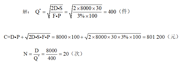 【例8-1】某服装商场每年需要购买8 000套儿童服装,每套服装的价格是100元,其单位保管费为服装的价格的3%,每次订购费为30元。试求企业的经济订货批量、年总成本和订购次数?