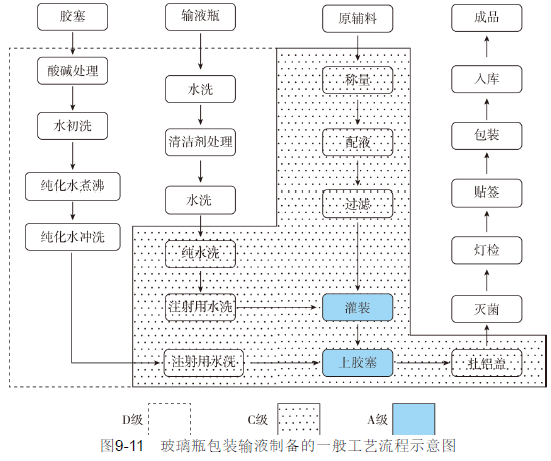 玻璃瓶包装输液制备的一般工艺流程如图9-11所示。