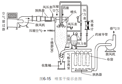 喷雾干燥法是流态化技术用于浸出液干燥的一种较好方法,系直接将浸出液喷雾于干燥器内使之在与通入干燥器的热空气接触过程中,水分迅速汽化,从而获得粉末或颗粒的方法。最大特点是物料受 热表面积大,传热传质迅速,水分蒸发极快,几秒钟内即可完成雾滴 的干燥,且雾滴温度大约为热空气的湿球温度(一般约为50 ℃左右), 特别适用于热敏性物料的干燥。此外,喷雾干燥制品质地松脆,溶解性能好,且保持原来的色香味。可根据需要控制和调节产品的粗细度 和含水量等质量指标。喷雾干燥法不足之处是能耗较高,进风温度较 低时,热效率只有30%~40%;控制不当常出现干燥物黏壁现象,且成品收率较低;设备清洗较麻烦。图6-15为喷雾干燥示意图。