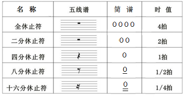 记录声音静止的符号叫做休止符。全休止符写在第四线下方;二分休止符写在第三线上方;四分休止、八分休止、十六分休止符写在第二线到第四线之间。