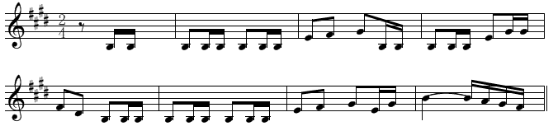 这一节奏型,是通过模仿军鼓的节奏,展现了人民起义的磅礴场面,突出表现了人民热情、刚毅、勇敢斗争的精神。