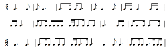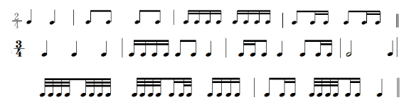 1.以四分音符为一单位拍的拍子,每个单位拍构成一个音群,每小节可有两个或三个单位拍。