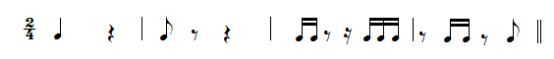 休止符组合法与音符组合法相同,按照单位拍进行组合。不论单拍子、复拍子或混合拍子,如果整小节休止时,均用全休止表示。
