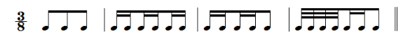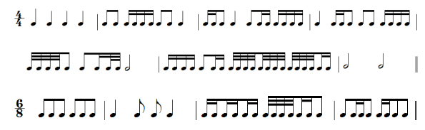 2.以八分音符为一拍的拍子,可将三拍的符尾连在一起,第二条、第三条符尾则应按照单位拍分开。