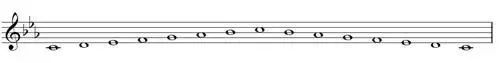 自然小调是小调式的原型,由七个音级组成。由I级音开始上行到高八度的I级音,相隔两音的音程关系依次为:全音、半音、全音、全音、半音、全音、全音。其中, II--III、V--VI为半音,其余为全音。自然小调I级音(主音)到 上方III级音为小三度,I级音(主音)到上方VI 级音为小六度,所以自然小调的听上去较为柔和、色彩较为暗淡。