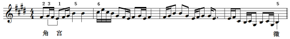上例为A调,A唱作do(宫音),第一小节出现宫角大三度(A-#C)。主音#F唱作6为羽音,属于#F羽调。旋律音在五个正音基础上加入了两个偏音:#4(变徵)、7(变宫),所以调式类型为#F羽调式(雅乐)。