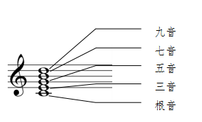 按三度音程关系叠置构成的和弦。各音的名称由下而上命名依次为根音、三音、五音、七音、九音。
