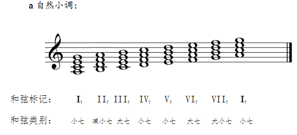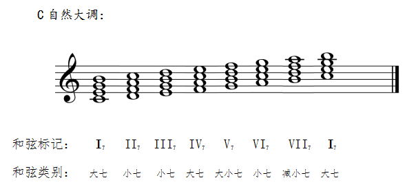 以大小调式中的各级音为根音构成的七和弦,即调式中的七和弦。原位七和弦以根音在调式中的级数用罗马数字标记并在右下方加“7”标记。如V级原位七和弦标记为。转位七和弦在音级罗马数字右方加“