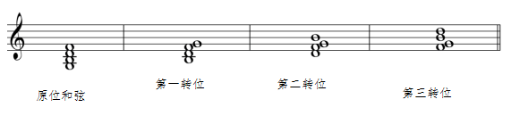 七和弦的根音为低音的和弦叫做原位和弦,以七和弦的三音、五音、七音为低音的和弦叫做转位和弦。