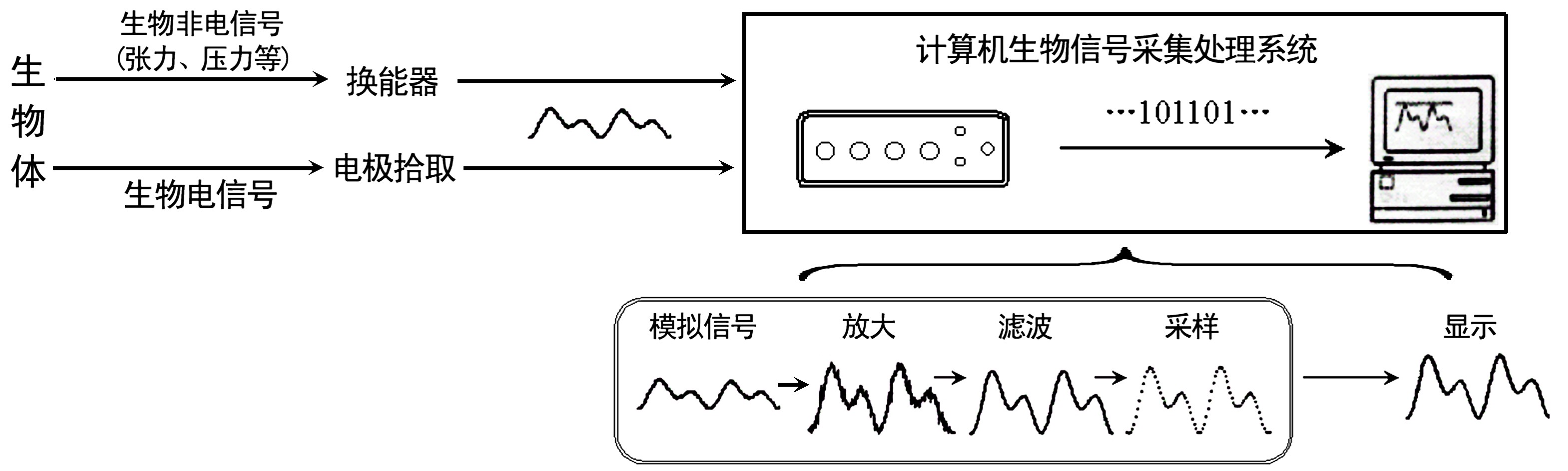 下面给出的生物电信号或经换能器转换的电信号记录原理的示意图中,简略表述了电信号的一般拾取方法。实验中记录的电信号有两类:一类是组织细胞兴奋时产生的生物电变化。这一类电信号可以是组织细胞自己发生的,例如心电信号,称自发生物电信号。多数情况是实验者通过剌激器诱发产生的,也叫诱发生物电信号。记录生物电信号的技术要求较高,特别是在整体动物上记录困难更大一些。非生物电信号(压力、张力、体液量、温度等)须经换能器转换为模拟电信号。生物电信号和模拟电信号输入示波器或记录仪,或微机生物信号采集处理系统。