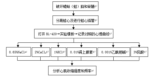 蛙类手术器械一套、眼科手术剪、蛙心夹、蛙心插管、铁支架;三维调节器、试管夹、双凹夹、滴管、棉线、小烧杯、传感器、BL-420生物信号采集与处理系统、任氏液、低钙任氏液(所含CaCl2为一般任氏液的1/4,其它成份不变)、0.65%NaCl溶液、1%CaCl2溶液、2%CaCl2溶液、3%乳酸溶液、2.5%NaHCO3溶液、0.01%肾上腺素、1%KCl溶液、0.001%乙酰胆碱。