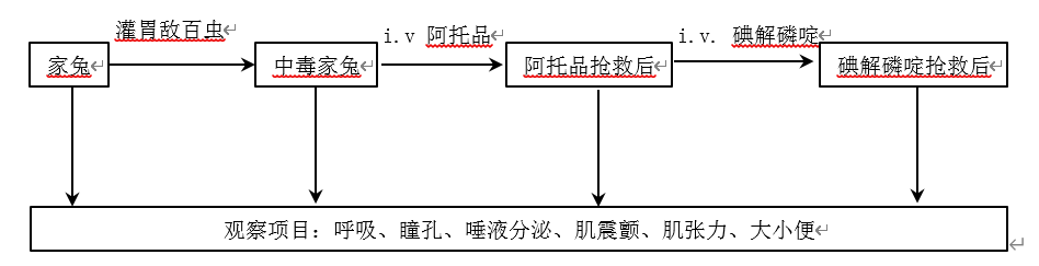 二、器材药品:家兔开口器一个、胃管一个、1ml、5ml、20ml注射器各一支、250ml烧杯1个、婴儿秤1台、瞳孔测量尺一把、滤纸、5%敌百虫、2.5%碘解磷定(PAM)、0.2%阿托品(Atropine)。