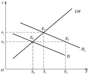 从IS-LM模型看,财政政策效应是指IS曲线移动对国民收入变动的影响。这里考察扩张性财政政策的情况,紧缩性财政政策与之相反变动。如图所示,当IS曲线和LM曲线相交于E0点时,决定均衡的利率水平r0和均衡收入水平Y0。假定利率水平保持不变,政府支出增加提高总需求水平,促使IS曲线右移至IS1的位置,均衡收入增加到Y2,产品市场实现新的均衡E2。但是由于收入水平的提高使货币需求增加,在原来利率水平上存在着货币的过度需求。在保持实际货币供给量不变的情况下,利率从r0上升至r1的水平。企业的计划投资支出下降,总需求相应降低,即产生“挤出效应”,收入水平从Y2下降到Y1。这一过程持续到两个市场都处于均衡状态,即达到E1点,两个市场同时实现新的均衡。此时,均衡收入增加,利率水平上升。