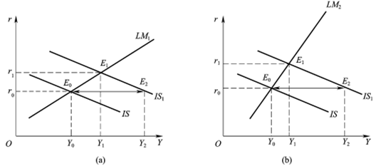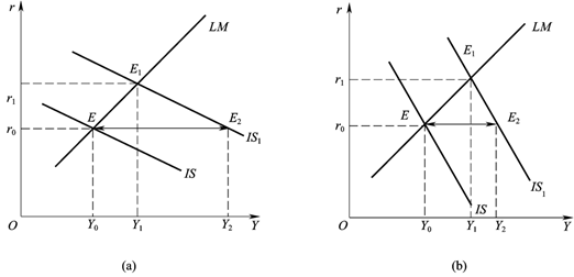 (2)IS曲线斜率不变,LM曲线斜率不同的财政政策效果。如图3所示,IS曲线斜率相同,(a)图中LM1曲线更为平坦,斜率较小;(b)图中LM2曲线斜率更为陡峭,斜率较大。假定初始均衡位置所对应的均衡利率水平和国民收入水平都相同,即E0点。政府实行同样的扩张性财政政策,引起IS曲线右移至IS1,但因LM曲线的斜率不同,IS曲线移动引起的收入水平的变动也不同。图(a)中扩张性财政政策引起均衡收入增加较少,图(b)中扩张性财政政策引起均衡收入增加较大。