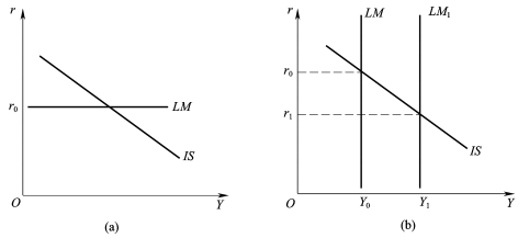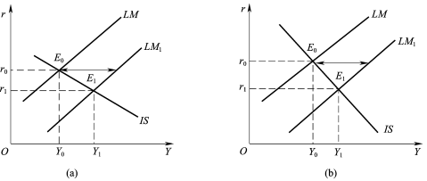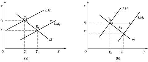 (2)IS曲线斜率不变,LM曲线斜率不同的货币政策效果。如图6所示,IS曲线的斜率相同,(a)图中LM曲线更为平坦,斜率较小,货币政策效应较小;(b)图中LM曲线斜率更为陡峭,斜率较大,货币政策效应较大。这是因为LM曲线较平坦,表示货币需求的利率弹性较大,即货币供给的较大变动只能引起利率、从而投资的较小变动,从而国民收入增加较少,货币政策效应较小;反之,亦然。