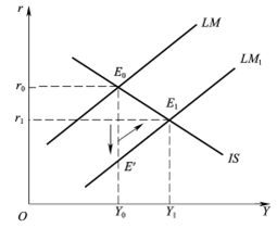 货币政策效应是指货币当局改变货币供应量对均衡收入的影响程度。从IS-LM模型看,货币政策效应是指LM曲线移动(即货币政策的扩张或收缩)对均衡国名收入水平的影响。如图4所示,当实际货币供给量发生变化后,首先形成资产组合的非均衡而引致利率的变化。在初始均衡点E0,货币供给量的增加使LM曲线移至LM1,产生了过度货币供给,即在现行利率和收入水平上,人们持有了超过他们意愿的货币量,居民将试图通过购买其他资产来减少已持有的货币,从而资产价格上升而收益下降,均衡点迅速向下移动至E′点,此时货币市场出清,居民因利率已充分下降而愿意持有较多货币。这时,产品市场存在着过度需求,企业增加投资,使得产出和收入增加。因而均衡点沿LM1曲线向上移动到E1,两个市场同时实现新的均衡。此时,均衡收入增加,利率水平下降。