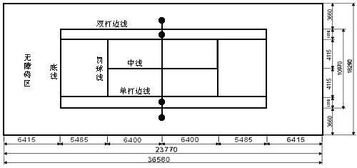 网球场长23.77米,双打宽10.97米,单打宽8.23米,用中央高度为0.914米的球网将全场横隔为两等区;球网两端悬挂在1.07米高的网柱上,网柱中心距边线外0.914米;除端线宽度为10厘米外,其余各线均为5厘米。场地丈量都从线的外沿计算;端线后至少要有6.40米的空地,边线外至少有3.66米的空地。(图10-3-1)