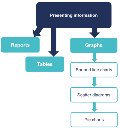 Present information using tables, chartsand graphs (bar charts, line graphs, pie charts and scatter graphs)