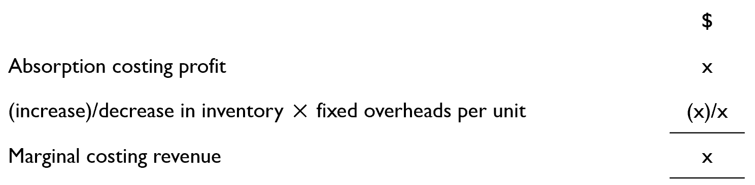 This is because in absorption costing,fixed overheads held in closing inventory are carried forward to the nextaccounting period instead of being written off as a period cost in the currentaccounting period as in marginal costing.