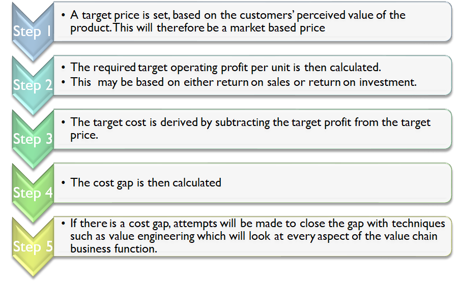 }The target cost is calculated by deducting the target profit from a pre-determined selling price based on customers’ views.