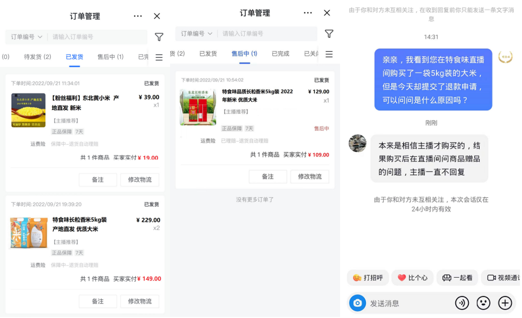 小艾与特食味沟通后,发现特食味不仅直播订单量在逐步减少,而且粉丝数量也在下降。针对直播订单问题,小艾准备先看看特食味的直播订单处理情况,查看是否存在发货不及时、服务不到位等,然后再制定一系列粉丝维护的方案,以促进特食味的粉丝留存。直播订单处理是直播销售后非常重要的一项工作,商家日常需要对直播订单进行查询和处理,保证及时发货、商品物流正常,从而保证及时完成每一笔订单,进一步提升和维护用户的购物体验,具体操作如下: 打开抖音App,点击“我”选项。在打开的界面中点击“商品橱窗”按钮。打开“商品橱窗”界面,在“我的小店”栏中点击“订单管理”按钮。打开“订单管理”界面,点击“待发货”选项卡,查看用户下单后等待发货的商品,发货后点击按钮,在打开的界面中上传物流单号。然后还可以通过私信告知用户商品已经发出。