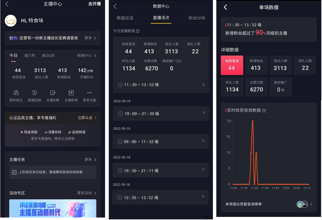 查看单场数据:点击最近一场直播,进入“单场数据”界面,在其中即可查看该场直播的相关数据,包括收获音浪、新增粉丝、观众人数、送礼人数、点赞人数等。
