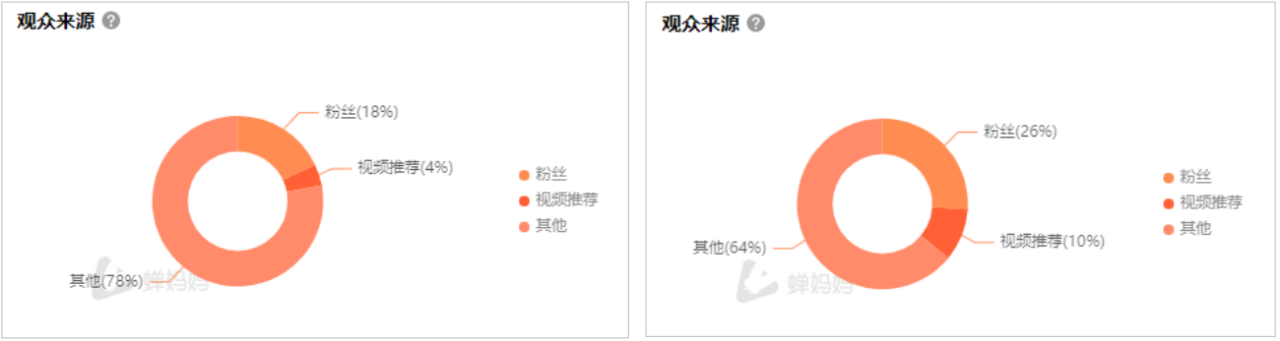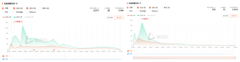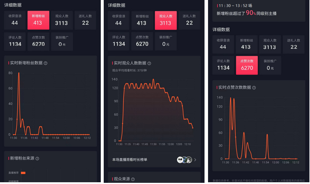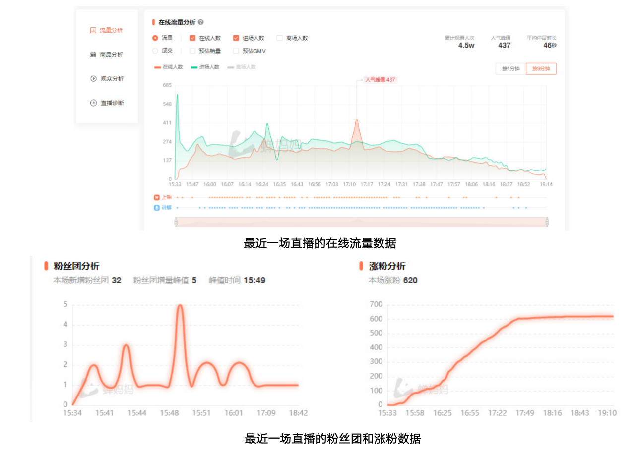 用户来源数据流量相关数据对比,包括粉丝团数据、涨粉数据和在线流量数据。其中,粉丝团数据包括“本场新增粉丝团”“粉丝团增量峰值”“峰值时间”及增量趋势等 ;涨粉数据包括本场涨粉和新增粉丝人数走势 ;在线流量数据主要包括累计观看人次、人气峰值、平均停留时长、在线人数、进场人数等。