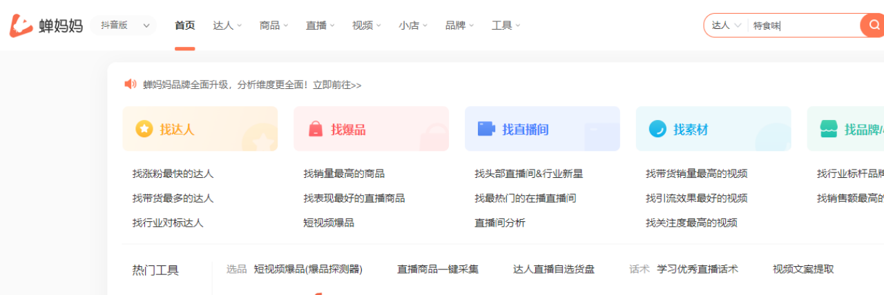 输入搜索内容:进入“蝉妈妈 抖音版”页面,在页面右上角的搜索框中输入“特食味”,按【Enter】键进行搜索。