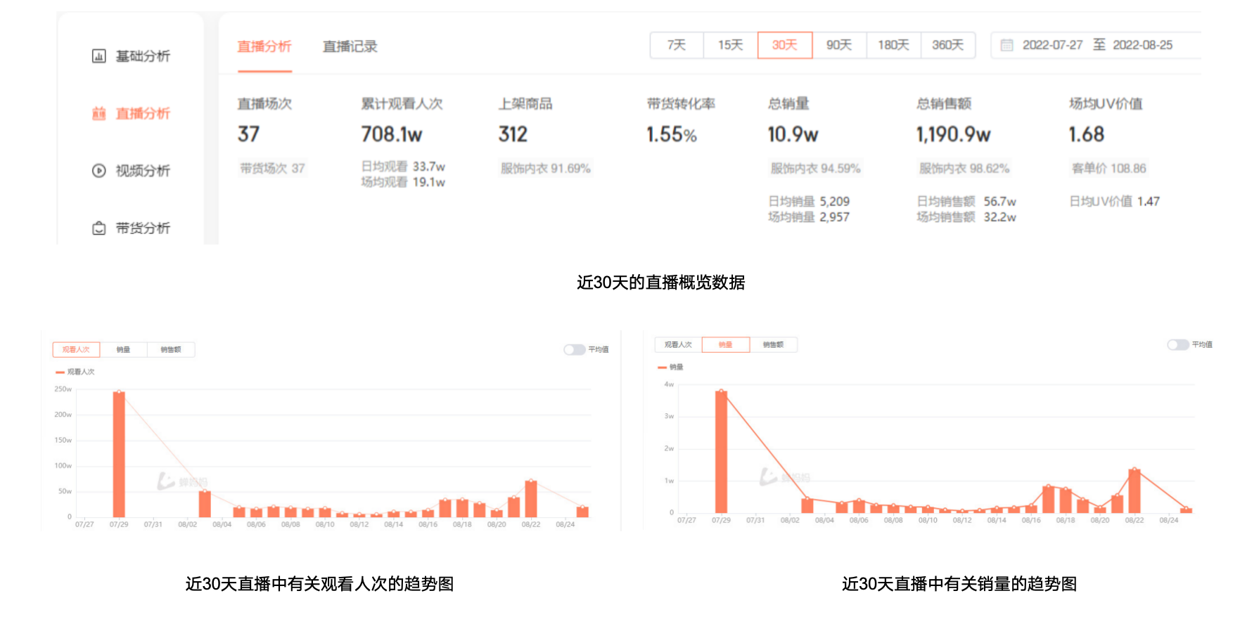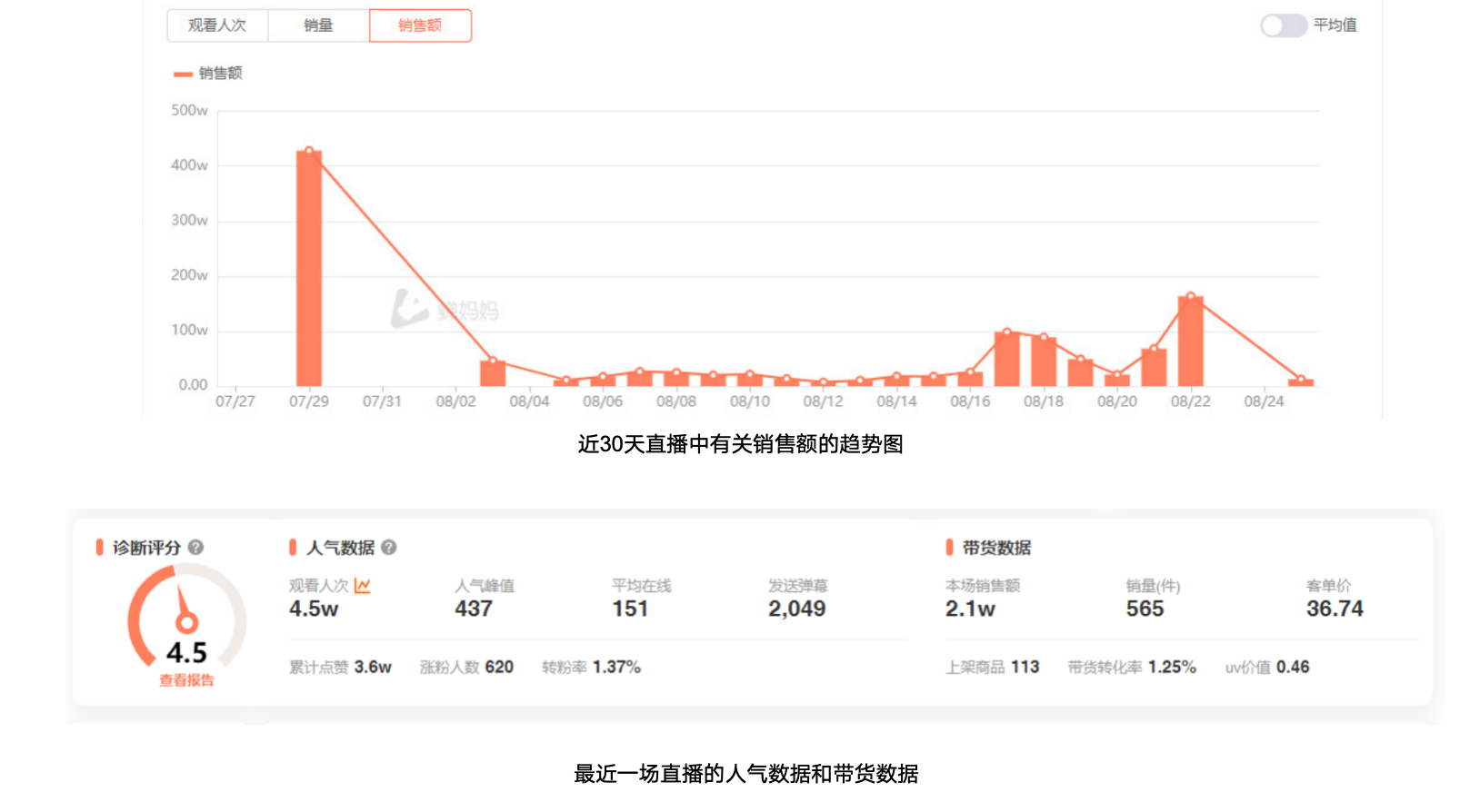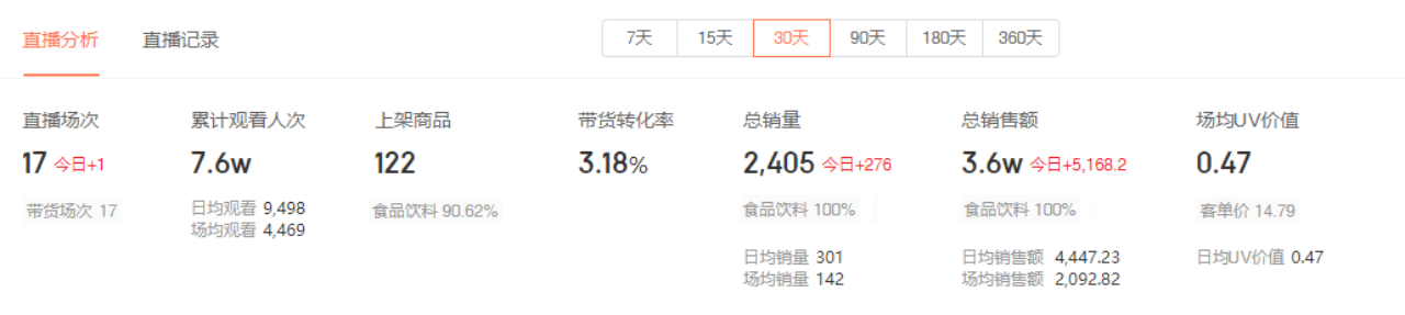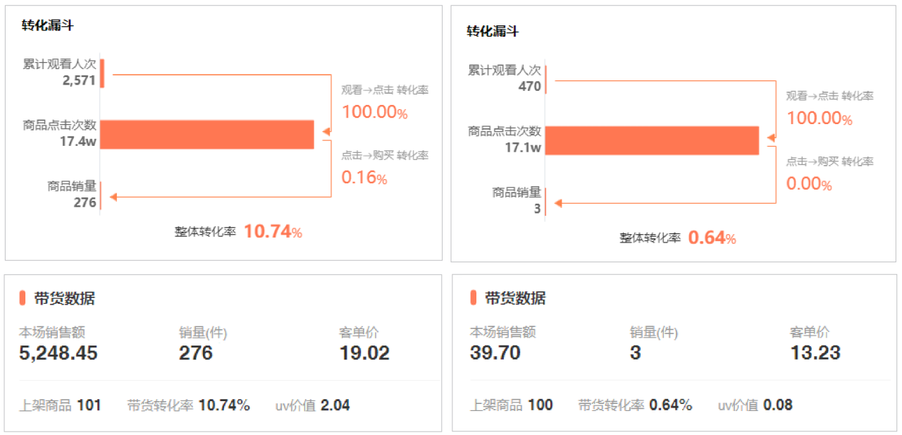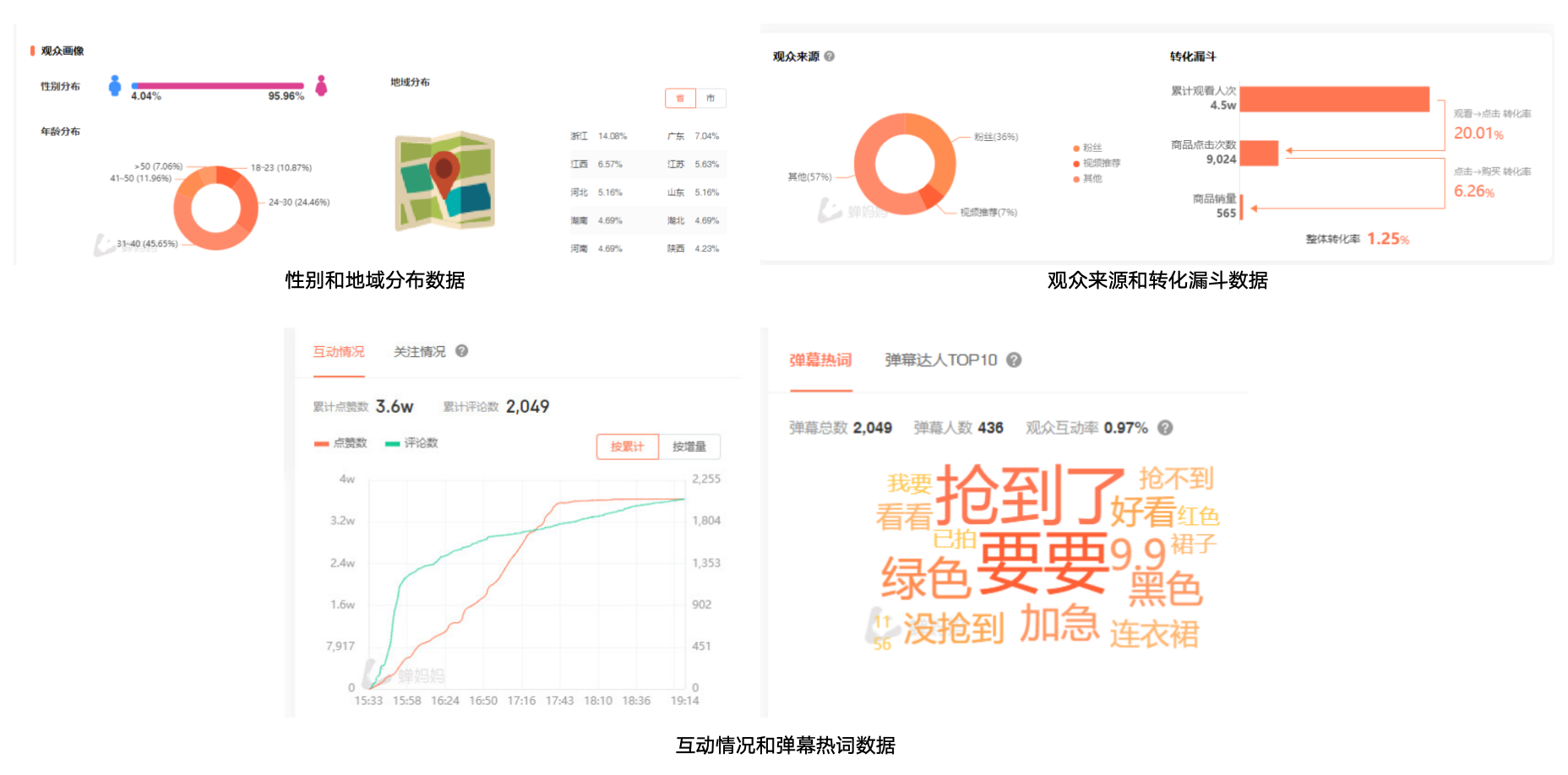 互动数据转化数据,包括商品点击次数、观看→点击转化率、点击→购买转化率、销售额、销量、客单价、上架商品、带货转化率和 UV 价值等。
