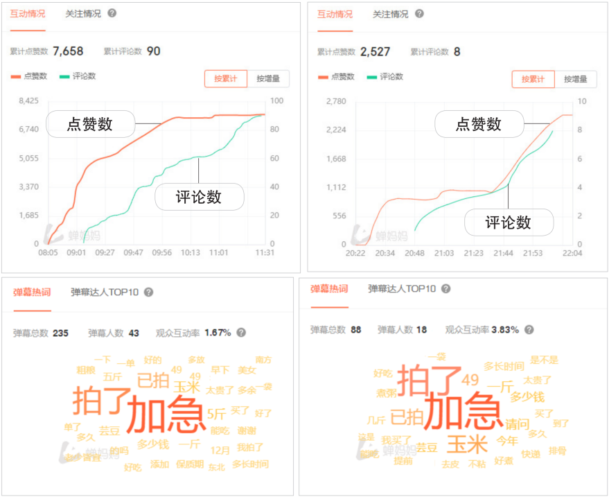 流量分析2用户互动相关数据,包括互动情况、弹幕热词。其中互动情况包括累计点赞数、累计评论数、点赞数变化趋势和评论数变化趋势等;弹幕热词包括弹幕总数、弹幕人数和观众互动率等。