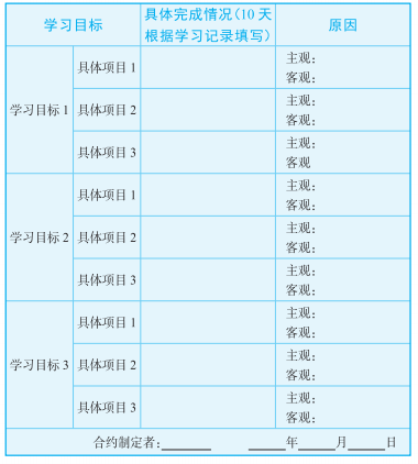 (1)制订一个切实可行、符合自身实际、具体明确的10天学习目标和学习计划,将这份“与自己签订的学习合约(见表)”认真填写好。