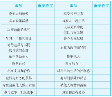 评估你生命中各种重要的事情(如表所示):非常重要=1,比较 重要=2,不重要=3,将评估结果填写在横线上。