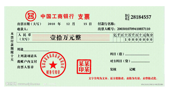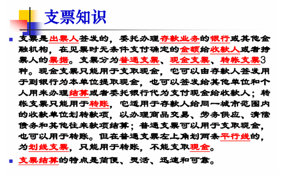 支票是银行的存款人签发给收款人办理结算或委托开户银行将款项支付给收款的票据,分为现金支票和转帐支票两种。现金支票可以从银行提取现金,不可以转帐;转账支票只能转账,不能提取现金。支票结算具有方便、灵活的特点,是同城结算中使用较多的一种结算方式,适用于单位、人体经营户和个人在同一城市或一定的区域范围内的商品交易和劳务供应及其他款项的结算。