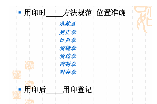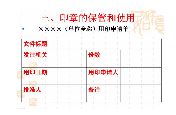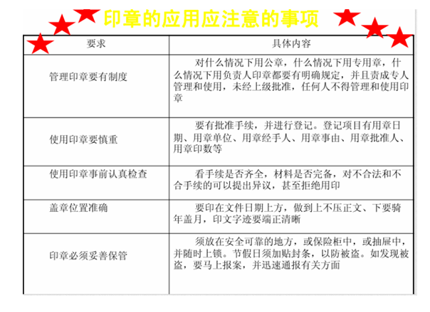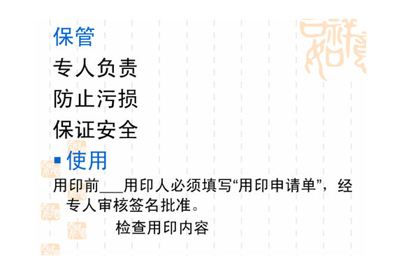 使用印章时必须经过领导人批准,并进行认真的登记,登记内容包括用印时间、当事人、用印原因和结果,如果有必要可用更详细的说明。未履行手续或手续不全时,不得用印。
