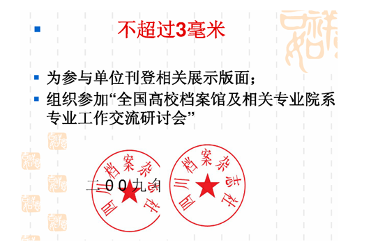 用印时应注意盖在正确的位置,一般应盖在文件成文日期的上方,上不压正文,下骑年盖月; 印中的文字要端正、清晰,不得模糊歪斜。