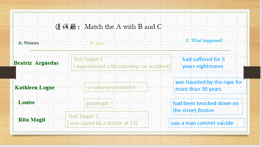 注:本测验为两大题:第一题为选择题(实际为连线题,把人名和她的相关信息、遭遇三者相匹配,具体见下截图)。第二题为填空题。