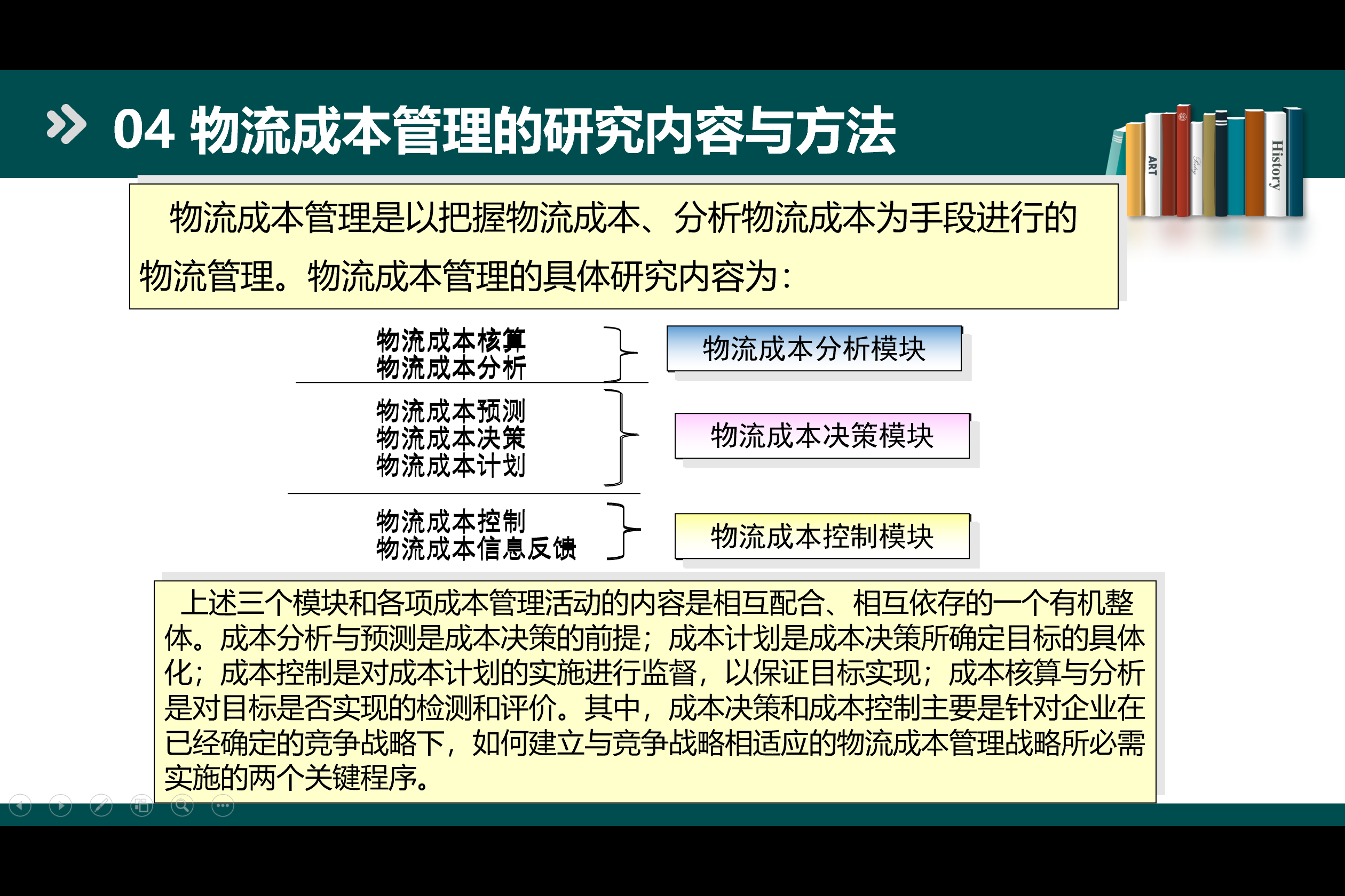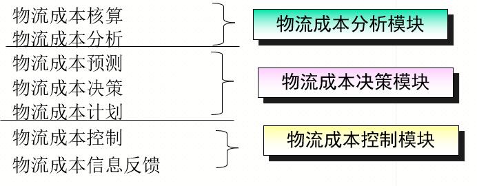 上述三个模块和各项成本管理活动的内容 是相互配合、相互依存的一个有机整体。成本分析与预测是成本决策的前提;成本计划是成本决策所确定目标的具体化;成本控制是对成本计划的实施进行监督,以保证目标实现;成本核算与分析是对目标是否实现的检测和评价。其中,成本决策和成本控制主要是针对企业在已经确定的竞争战略下,如何建立与竞争战略相适应的物流成本管理战略所必需实施的两个关键程序。