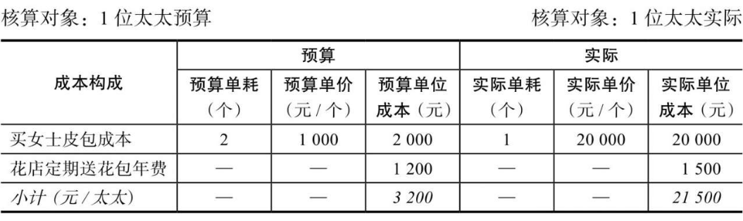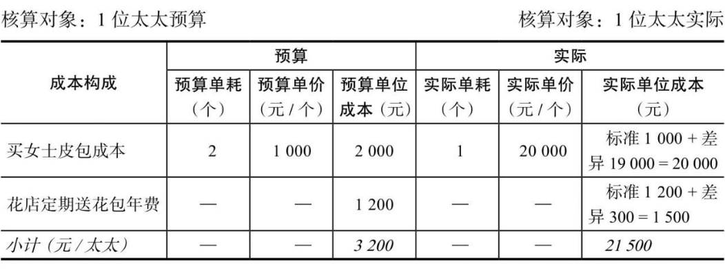 另外,丈夫老王委托花店送花,预订了一年的定期送花服务,预付给花店打包总额1200元。花店送花可以理解为维护情感费用,属于“固定费用”。我们这样理解这张表:这些投入属于感情维护费,会让1位太太更开心,于是就假设核算对象是1位太太预算。此时,年度预算总成本=2000元女包+1200元送花=3200元/太太,这是在年初已经布局好的往年一贯的标准,见上表中的预算。实际买包消费(投入原材料)时,太太偶然看到一个品牌名包,很喜欢,就跟丈夫老王说:“原来打算买2个包(1000元/个,共计2000元),现在这两个包我都不要了,就换1个20000元的包就可以了。”丈夫老王欣然同意,于是一年实际花费了20000元的女士皮包成本。买包成本从2000元变为20000元,变化较大,因此属于“变动成本”。单耗标准也发生了变化,年预算单耗为2个包/太太,变成了1个包/太太。——单耗和单价都变化了。实际送花的“固定费用”预算也变了,预算是预付给了花店1200元,但是到了年底,花店老板说:“今年成本增加了,所以定期送花的打包年费也涨价300元,变成1500元,需要再另支付300元。”丈夫老王也同意了。年底,核算对象为1位太太实际,实际总成本花费了21500元,因此,上述变动成本和固定费用,实际均较预算发生了改变。我们来看看标准成本法的成本核算步骤过程及分录。