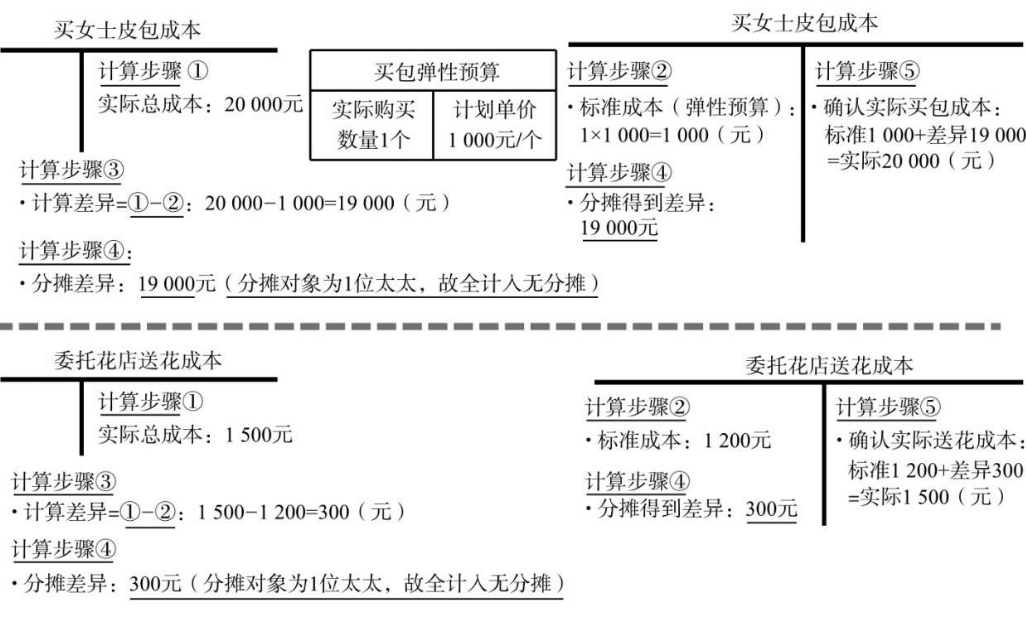(3)然后计算差异:差异=实际买包总成本20000元-弹性预算1000元=19000元