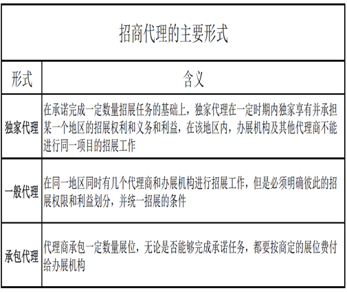 会展营销代理是会展项目、尤其是国际会展项目非常重要的营销渠道,它可以提高会展营销活动的专业性和效率,减轻会展组织者的营销压力,提高营销效果。通常,会展项目使用营销代理,特别是招展代理的情况最为多见,招展代理的主要形式包括:独家代理、一般代理、承包代理三种形式。