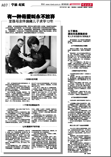 吕昊泽是宁波城市职业技术学院2011级学生,一名硬肿症和脑瘫患者,因为生活不能自理,妈妈只能随身陪读。