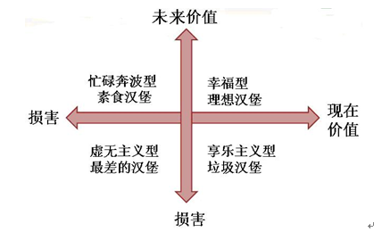 第一种类型的汉堡它虽然口味诱人,却是标准的“垃圾食品”。吃它等于去享受眼前的快乐,而埋下了未来的痛苦。及时享乐而出卖未来幸福的人生,可以称为“享乐主义型”。“享乐主义型”的格言就是“及时行乐,逃避痛苦”,他们注重的是眼前的快乐,不为任何可能发生的负面后果而担忧。