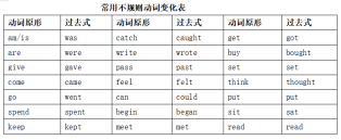 1、改变动词中的元音:begin→began drink→drank come→came eat→ate grow→grew run→ran know→knew win→won speak→spoke take→took write→wrote get→got