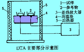 DTA的工作原理:将试样与惰性参比物并放在一金属块(均温块)的适当位置上,如图所示,此块放在加热炉的中部,按一定速度升温或降温。通过均热块使试样和参比物处于同一温度物中。