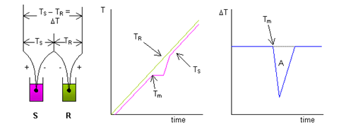 当试样在某一温度下发生物理或化学变化,则会放出或吸收一定的热量,此时示差电动势(ΔT)就会偏离基线,出现差热峰。