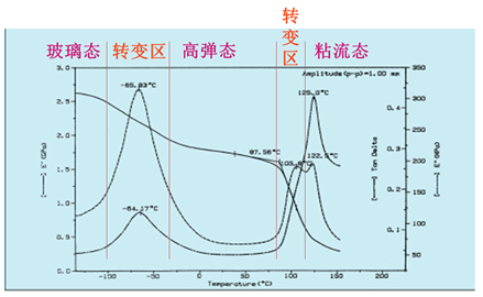 测温度谱时,原则上维持应力和频率不变,也称热机械谱图由下图所示: