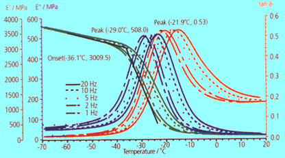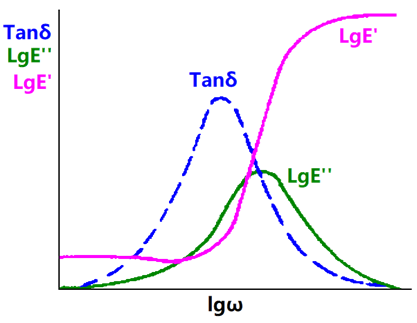 频率谱,即频率扫描模式是在恒温、恒应力下,测量动态模量及损耗随频率变化的试验,用于研究材料力学性能与速率的依赖性。如图是典型非晶态聚合物频率谱图。